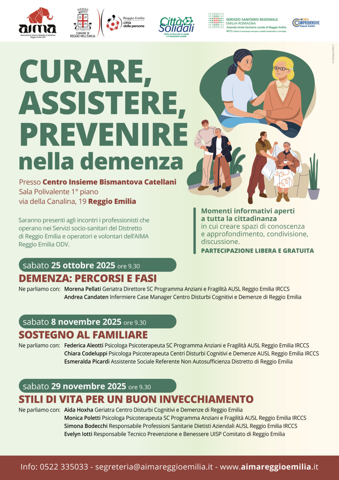 Si tratta di incontri gratuiti e aperti a tutta la cittadinanza, pensati per creare spazi di conoscenza e approfondimento, condivisione e discussione anche grazie alla presenza di professionisti dei Servizi socio-assistenziali del Distretto di Reggio Emilia e volontari di AIMA Associazione Italiana Alzheimer Reggio Emilia ODV.
