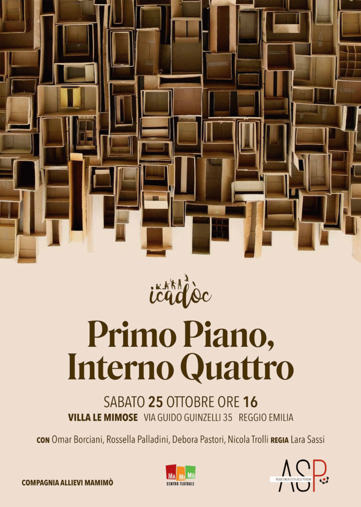 Sabato 25 ottobre alle ore 16.00, la Casa Residenza Villa Le Mimose ospiterà un evento teatrale unico nel suo genere: la Compagnia Icadòc – Allievi MaMimò, porterà in scena una divertente commedia, diretta dalla regista Lara Sassi, con una scenografia speciale. “Primo piano, interno quattro” è una commedia delicata e spietata sul paradosso della normalità, sull’assurdità del consumismo, e sul reale valore delle cose e delle persone