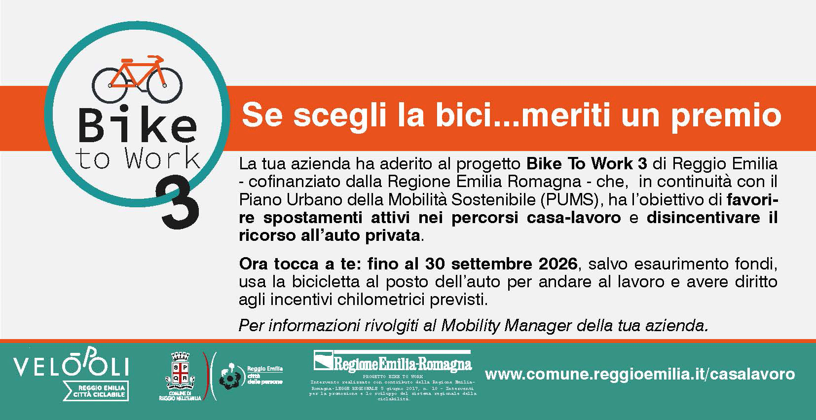 ASP REGGIO EMILIA ha aderito nuovamente al progetto Bike To Work III di Reggio Emilia – cofinanziato dalla Regione Emilia Romagna – che, in continuità con il Piano Urbano della Mobilità Sostenibile (PUMS), e all’interno del prossimo Piano aziendale Spostamenti Casa-Lavoro (PSCL), ha l’obiettivo di favorire spostamenti attivi nei percorsi casa-lavoro e disincentivare il ricorso all’auto privata.